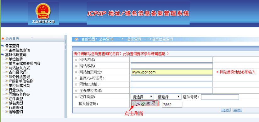 選中“網站首頁網址”方式后,提示“ * 網站首頁地址必須輸入”,我們輸入要查詢的網站地址首頁,例如輸入http://www.baidu.com,再輸入驗證碼,點擊頁面底部的“提交”按鈕即可進行查詢。